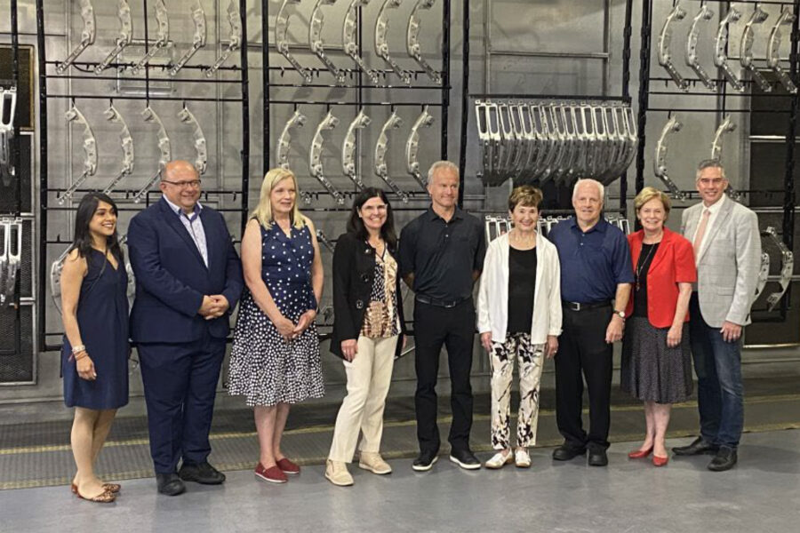 Group photo of Kitchener Centre MPP Daiene Vernile, left, Kuntz Electroplating excutive vice-president Dave Kuntz, Waterloo Region Chair Ken Seiling and Kitchener Mayor Berry Vrbanovic